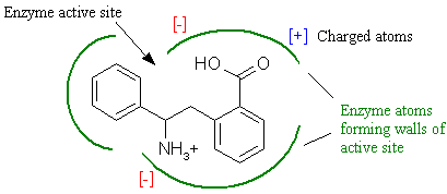 In addition to steric complementarity, electrostatic interactions influence ligand binding. Charged receptor atoms often surround the active site, imparting a localized charge is specific regions of the active site. From physics, we know that opposite charges attract while similar charges repel. Electrostatic complementarity further restricts the binding of inappropriate molecules since the ligand must contain correctly placed complementary charged atoms for interaction to occur.