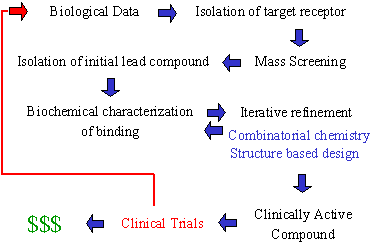 The modern day drug discovery pipeline is outlined in Figure 5. The first step is to determine an assay for the receptor. An assay is a chemical or biological test that turns positive when a suitable binding agent interacts with the receptor. Usually, this test is some form of colorimetric assay, in which an indicator turns a specific color when complementary ligands are present. This assay is then used in mass screening, which is a technique whereby hundreds of thousands of compounds can be tested in a matter of days to weeks. A pharmaceutical company will first screen their entire corporate database of known compounds. The reason is that if a successful match is found, the database compound is usually very well characterized. Furthermore, synthetic methods will be known for this compound, and patent protection is often present. This enables the company to rapidly prototype a candidate ligand whose chemistry is well known and within the intellectual property of the company.