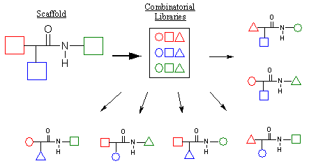 Combinatorial chemistry is a very powerful technique that chemists can employ to aid in the refinement of the lead compound. Combinatorial chemistry is a synthetic tool that enables chemists to rapidly generate thousands of lead compound derivatives for testing. As shown above in Figure 6, a scaffold is employed that contains a portion of the ligand that remains constant. Subsite groups (shown in red, green, and blue) are potential sites for derivatization. These subsites are then reacted with combinatorial libraries to generate a multitude of derivative structures, each with different substituent groups. One can see how a vast number of compounds can be generated as a result of the combinatorial process. If a scaffold contains three derivatization sites and the library contains ten groups per site, theoretically 1000 different combinations are possible. By carefully selecting libraries based upon the study of the active site, we can target the derivatization process towards optimizing ligand receptor interaction.