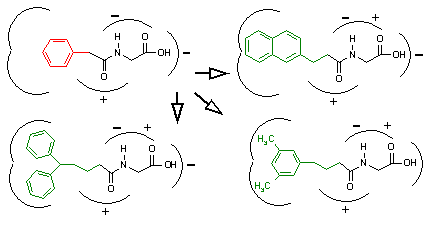 This is shown in Figure 3 above. In the upper left frame of this figure, we see our native ligand bound within the active site. Assume that through biochemical investigation, we determine that the phenyl ring (blue) and the carboxylic acid group (green) are vital to receptor interaction. Thus, we deduce that these two groups must be the pharmacophore that a ligand must present to the receptor for binding. In future drugs that we develop to mimic the native ligand, we must include these two pharmacophoric elements for successful binding to occur. This is shown in the upper right derivative compound where a bicyclic group has been substituted. Because it maintains the pharmacophore and retains its complementary size and shape, it has a reasonable chance of successfully binding. However, any drug that we develop which lacks a complete pharmacophore may not interact with the receptor target.