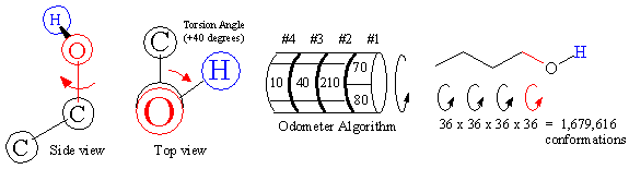 Although accurately calculating ligand receptor affinity remains the most scientifically challenging endeavor in drug design, searching all the rotatable bond configurations a ligand can adopt is the most demanding. A snapshot structure of the ligand at any instant in time is called a conformation, and is defined by the set of torsion angles between rigid groups. As shown in Figure 10B above, each rotatable bond can potentially spin 360 degrees, and the two attached groups define the torsion angle. The difficulty in determining all possible conformations lies in the combinatorial nature of the problem. Because each bond can potentially sweep the entire arc, an 'odometer' algorithm must be employed.