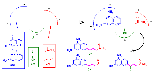 This is diagrammed in Figure 13C below. In this example, RACHEL determines that the naphthalene group (blue) and carboxylic acid group (red) of a ligand derivative should be replaced with other components to improve binding. The naphthalene group is large and very non-polar since it is strictly hydrocarbon. Conversely, the carboxylic acid group is quite small, but highly polar. Using the active site map as described above, RACHEL determines that these characteristics are indeed ideal for complementing the receptor at each respective component. Using the diversity index, RACHEL can cross-reference other database components that exhibit similar characteristics, as shown in the red and blue boxes on the right. These components are then combinatorially used to generate a new family of derivatives for testing. Each derivative retains the optimal receptor binding characteristics. However, enough variability is generated to potentially improve receptor complementarity.