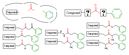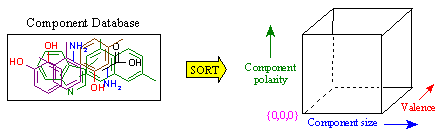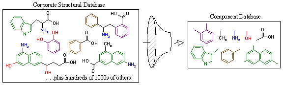 There are numerous advantages to extracting components in the manner described above. First, the storage of unique components allows the compression of a massive corporate database into a much smaller and manageable form. Typically a corporate database containing 100,000 structures may be comprised of only 5,000 individual components. This is because a few select components, such as methyl, hydroxyl, and amine groups, are utilized over and over again. Second, unique chemical constructions, for which only proprietary synthetic methods are known, are stored and available for use in future ligand design. This allows the user to take advantage of patented corporate chemistry and preserve the competitive edge gained from prior research.
