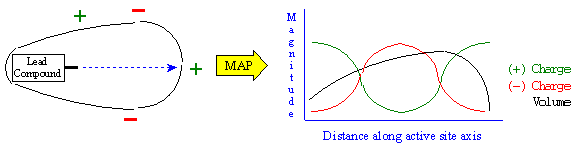 However, random sampling often diminishes the complementarity of reasonable binding compounds. This is the result of replacing satisfactory components with poor ones. For example, if a small methyl group or a highly charged fragment were to replace a large, hydrophobic ring on the ligand, it would ruin interaction with the receptor at that component. Instead, RACHEL incorporates a heuristic active site mapping algorithm as shown in Figure 13B to determine the optimal chemical characteristics to complement a given region of the active site. This technique maps chemical characteristics of the receptor, such as positive charge, negative charge, and active site volume as a function of distance along the active site axis. Using this active site map, RACHEL can determine the chemical characteristics most likely to complement the receptor at a given component location. RACHEL then determines a list of candidate fragments and substitutes them in a combinatorial fashion.