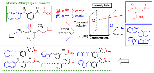 This diversity index offers a powerful means to improve the generation of complementary ligands. Over time, builder-type programs evolve compounds with improved binding. A moderate affinity structure has reasonable steric and electrostatic complementarity with the active site. However, components can still be added, deleted, or substituted to augment receptor interaction.