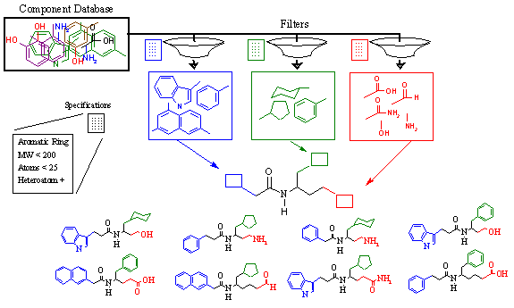 The goal of builder-type programs is to generate derivatives that are complementary to the active site. Both steric (size and shape) as well as electrostatic forces must be considered. The difficulty in accomplishing this lies in the sheer number of potential component combinations that are possible. As a result, nearly all commercial packages randomly select fragments for assembly. While this ensures an adequate sampling of components, it often leads to the selection of improper fragments. As such, many iterations of structure refinement are wasted generating poor derivatives.