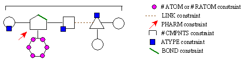 We see here the various constraints RACHEL can employ and how they relate to a given structure. In this hypothetical chemical structure, the geometric shapes represent different components while the lines connecting them correspond to rotatable bonds. The ATOM and RATOM constraints govern how many atoms a particular component can possess. The LINK constraint limits the atom types that can be utilized in rotatable bonds. The PHARM specification signifies that a specific atom type must be present at a precise location in the active site. The #CMPNTS restriction places upper and lower bounds on the total number of components a structure can possess. The ATYPE constraint stipulates how many atoms of a specific type can be present in both individual components as well as the entire structure. The BOND specification places limits on the bonded atom types that can be present within a component. As one can see, this again gives the user a tremendous amount of control over the structures generated by RACHEL.
